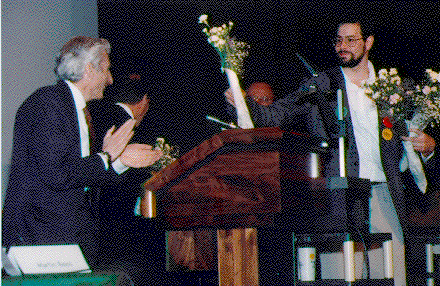 Bob Nemiroff presents flowers to debate participants