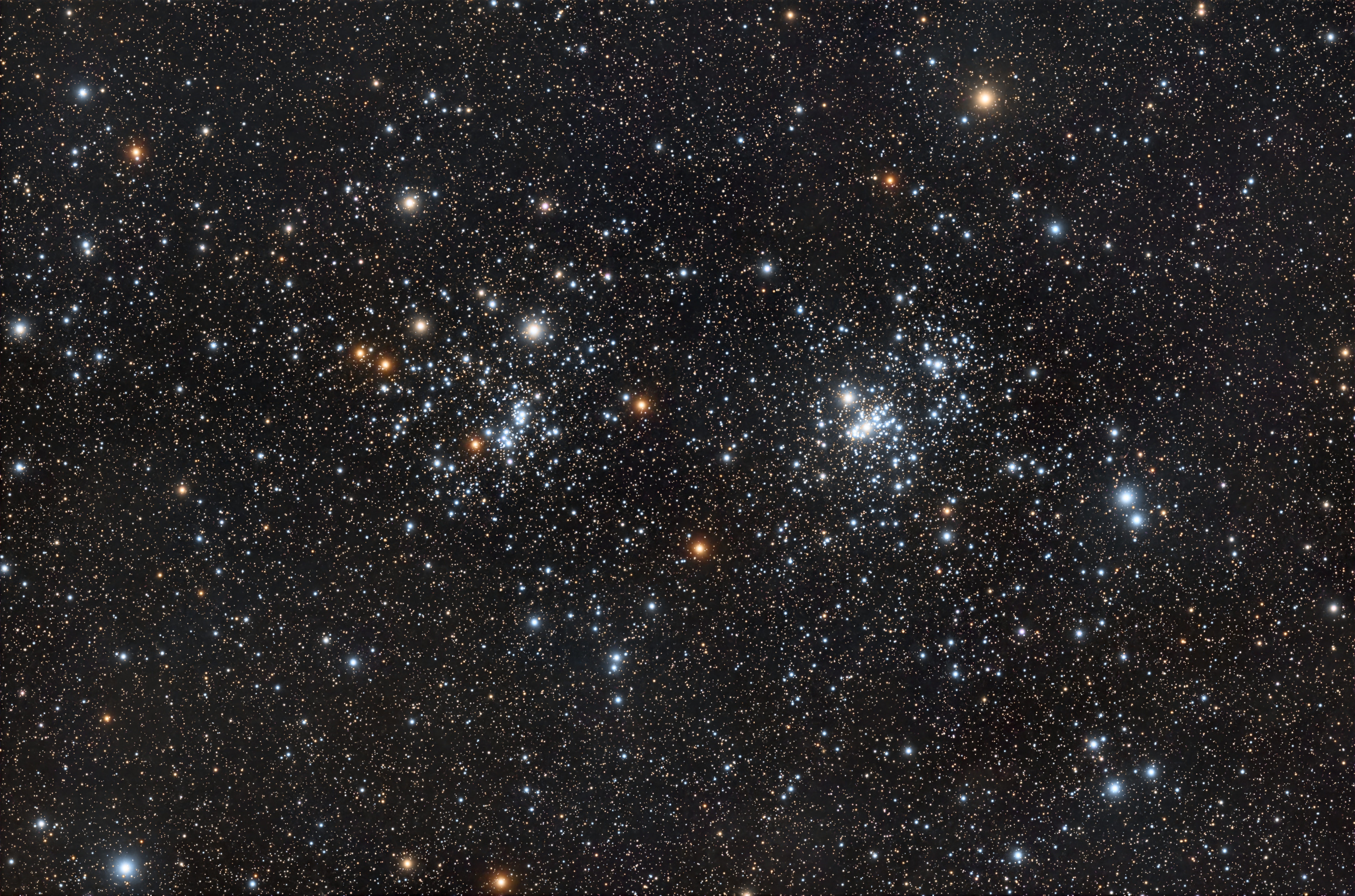 Explanation: This stunning starfield spans about three full moons (1.5 degrees) across the heroic northern constellation of Perseus. It holds the famous pair of open star clusters, h and Chi Persei. Also cataloged as NGC 869 (right) and NGC 884, both clusters are about 7,000 light-years away and contain stars much younger and hotter than the Sun. Separated by only a few hundred light-years, the clusters are both 13 million years young based on the ages of their individual stars, evidence that both clusters were likely a product of the same star-forming region. Always a rewarding sight in binoculars or small telescopes, the Double Cluster is even visible to the unaided eye from dark locations.
