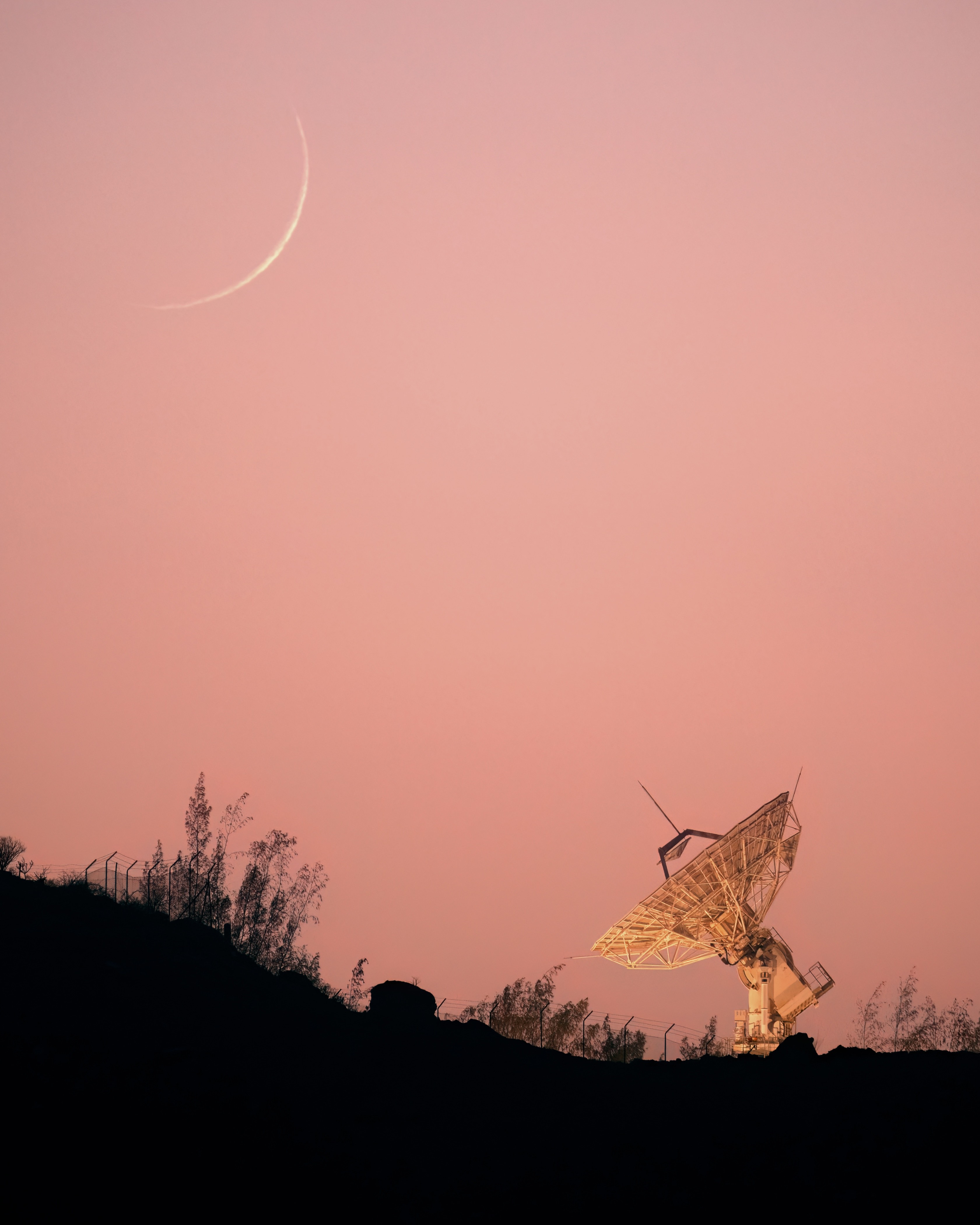 Explanation: A young crescent moon can be hard to see. That's because when the Moon shows its crescent phase (young or old) it can never be far from the Sun in planet Earth's sky. But even though the sky is still bright, a slender sunlit lunar crescent is clearly visible in this early evening skyscape. The telephoto snapshot was captured on August 24, with the Moon very near the western horizon at sunset. Seen in a narrow crescent phase about 1.5 days old, the visible sunlit portion is a mere two percent of the surface of the Moon's familiar nearside. At the Canary Islands Space Centre, a steerable radio dish for communication with spacecraft is tilted in the direction of the two percent Moon. The sunset sky's pastel pinkish coloring is partly due to fine sand and dust from the Sahara Desert blown by the prevailing winds.