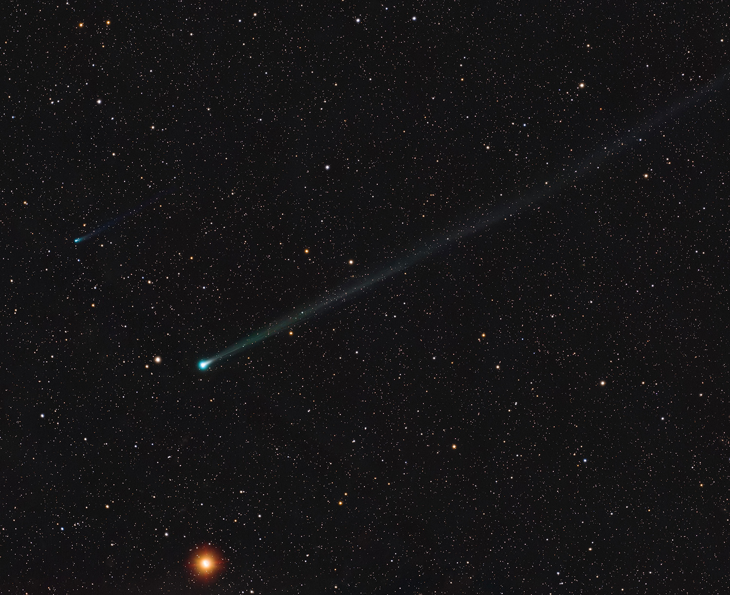Explanation: A new visitor to the inner Solar System, comet C/2025 R2 (SWAN) sports a long ion tail extending diagonally across this almost 7 degree wide telescopic field of view recorded on September 21. A fainter fellow comet also making its inner Solar System debut, C/2025 K1 (ATLAS), can be spotted above and left of SWAN's greenish coma, just visible against the background sea of stars in the constellation Virgo. Both new comets were only discovered in 2025 and are joined in this celestial frame by ruddy planet Mars (bottom), a more familiar wanderer in planet Earth's night skies. The comets may appear to be in a race, nearly neck and neck in their voyage through the inner Solar System and around the Sun. But this comet SWAN has already reached its perihelion or closest approach to the Sun on September 12 and is now outbound along its orbit. This comet ATLAS is still inbound though, and will make its perihelion passage on October 8.